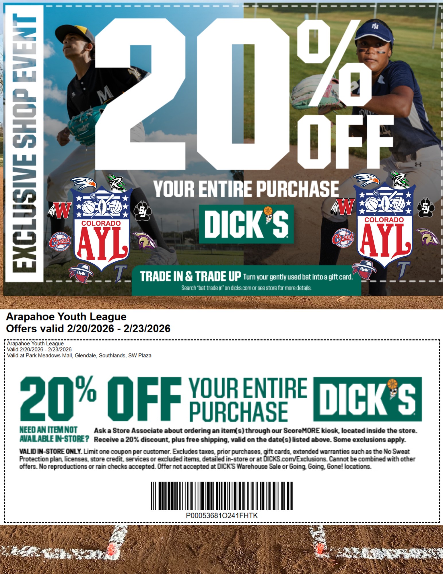 Our partner DICK’S Sporting Goods is offering all AYL families an exclusive discount of 20% off throughout the store! Be sure to grab all the things you will need for the upcoming winter sports season and Holiday shopping. To access exclusive savings, click the coupon linked below. The coupon is valid in-store only and must be shown at the register during checkout by clicking on the hyperlink.