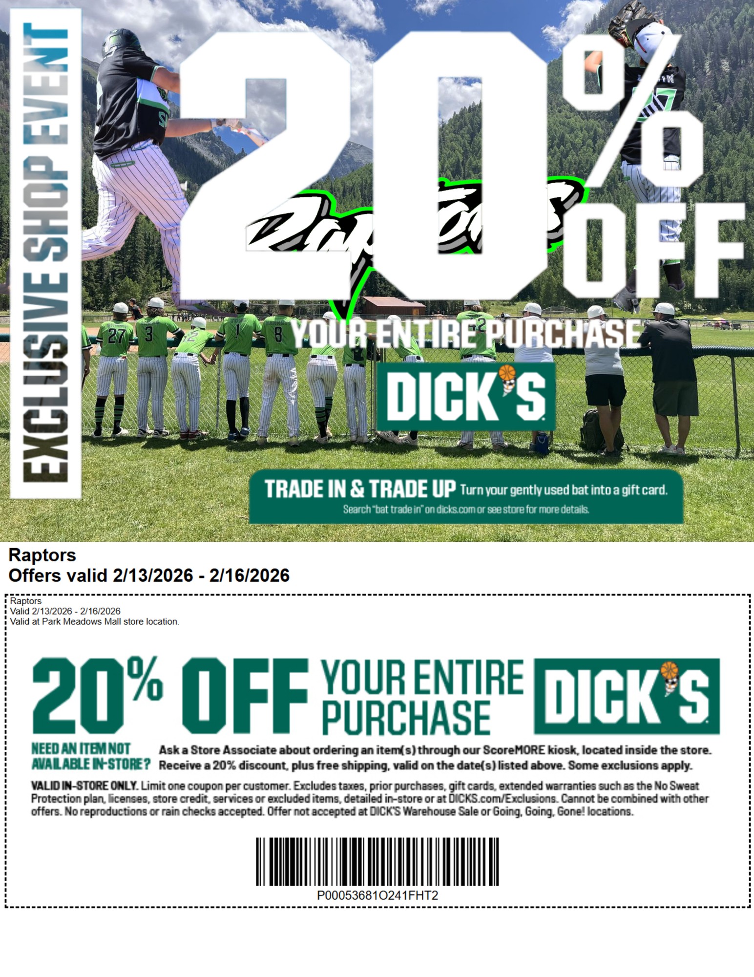 Our partner DICK’S Sporting Goods is offering all Raptors Baseball members an exclusive discount of 20% off throughout the store! Be sure to grab all the things you will need for the upcoming winter sports season and Holiday shopping. To access exclusive savings, click the coupon linked below. The coupon is valid in-store only and must be shown at the register during checkout by clicking on the hyperlink.